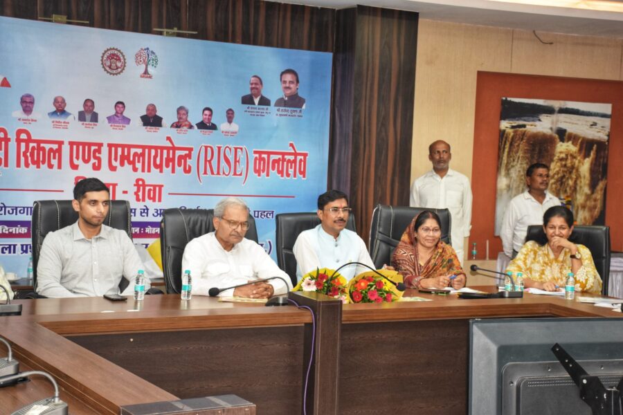 रीवा 27 जून 2025. रीवा में कलेक्ट्रेट के मोहन सभागार में रीजनल इंडस्ट्री स्किल एवं इम्प्लायमेंट कॉन्क्लेव का आयोजन किया गया। कॉन्क्लेव में मुख्यमंत्री डॉ मोहन यादव के रतलाम में आयोजित राज्य स्तरीय समारोह से उद्बोधन का सजीव प्रसारण दिखाया गया। मुख्यमंत्री डॉ यादव ने रीवा के दो सफल उद्यमियों फोर्टिफाइड चावल बनाने वाले दिनेश गुप्ता तथा सीमेंट बैग एवं टेक्सटाइल यूनिट चलाने वाले जयराम खन्ना से संवाद किया। मुख्यमंत्री ने दोनों उद्यमियों के प्रयासों की सराहना की। मुख्यमंत्री ने वीडियो कान्फ्रेंसिंग के माध्यम से सागर, पीथमपुर, अलीराजपुर के भी सफल उद्यमियों से संवाद किया।