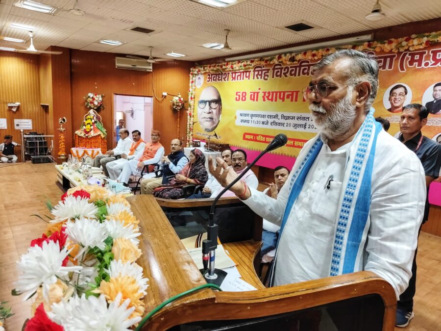 रीवा 20 जुलाई 2025. प्रदेश के पंचायत एवं ग्रामीण विकास तथा श्रम मंत्री और रीवा जिले के प्रभारी मंत्री श्री प्रहलाद सिंह पटेल ने कहा है कि शिक्षा में संस्कार के साथ स्वावलंबन, स्वाभिमान व मूल्य आवश्यक हैं। विश्वविद्यालय शिक्षा का उद्गम स्थल है, जहाँ से कई पीढ़ियाँ सफलताओं के शिखर पर पहुंचती हैं और आने वाले समय में भी पीढ़ियाँ उत्तरोत्तर आगे बढ़ती रहेंगी। उन्होंने विश्वविद्यालय की स्थापना के लिए मनीषियों के संकल्पों को पूरा करने का आह्वान किया। प्रभारी मंत्री ने अवधेश प्रताप सिंह विश्वविद्यालय के 58वें स्थापना दिवस पर विश्वविद्यालय परिवार को शुभकामनाएं दीं।
