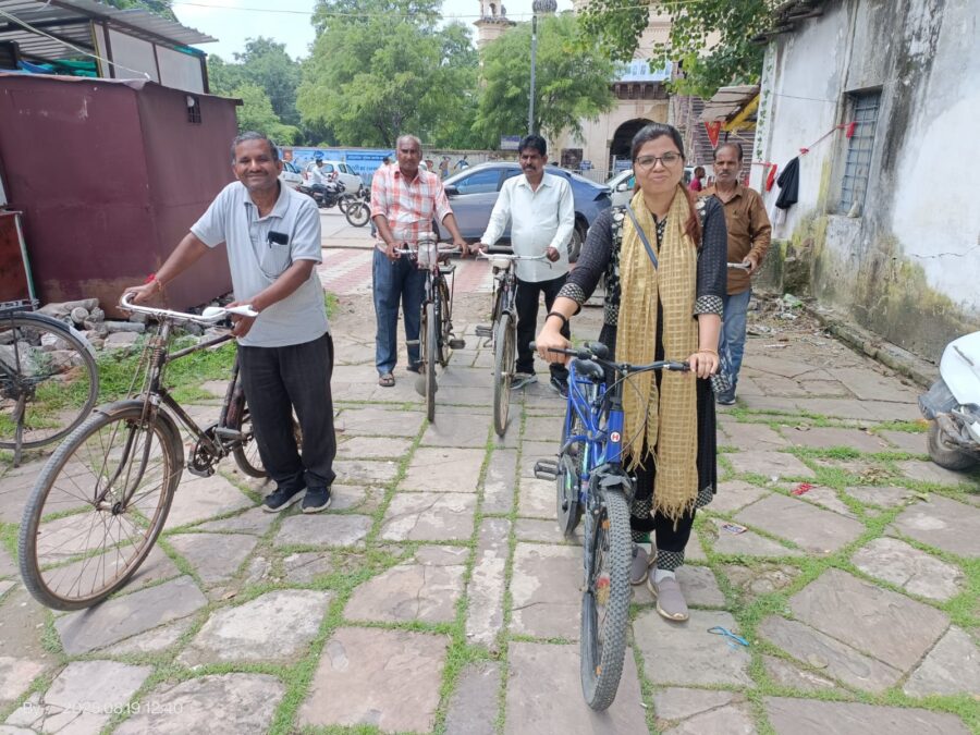 कलेक्टर और अन्य अधिकारी साइकिल तथा ई रिक्शा से पहुंचे कार्यालय