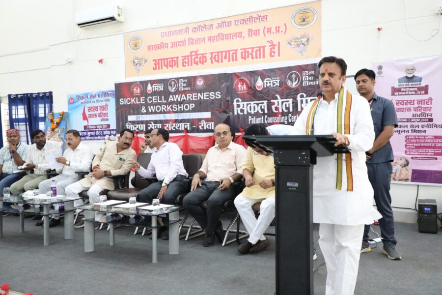शासकीय आदर्श विज्ञान महाविद्यालय में किरण सेवा संस्थान के संयोजकत्व में सिकल सेल एनीमिया जागरूकता एवं टेÏस्टग शिविर का आयोजन किया गया। उप मुख्यमंत्री ने कहा कि सिकल सेल एनीमिया एक रक्तविकार है जिससे बीमारी होती है इसकी जांच के उपरांत इलाज आवश्यक है। उन्होंने कहा कि किरण सेवा संस्थान बधाई की पात्र है जो इस क्षेत्र में सिकल सेल की जांच व उपचार का कार्य कर रही है। उप मुख्यमंत्री श्री शुक्ल ने कहा कि 17 सितंबर से 2 अक्टूबर तक संचालित सेवा पखवाड़ा अन्तर्गत स्वस्थ नारी सशक्त परिवार अभियान में सभी अपने स्वास्थ्य की जांच करायें। किशोरी बालिकाओं के स्वास्थ्य की जांचकर आभा कार्ड बनाये जा रहे हैं। उन्होंने कहा कि स्वस्थ रहने के लिये नियमित दिनचर्या में प्राणायम, योगासन, ध्यान करते हुए खानपान में सावधानी रखें। श्री शुक्ल ने कहा कि सरकार द्वारा चलाये जा रहे राइट टू स्क्रीनिंग अभियान का लाभ लें व स्वास्थ्य की जांच करायें। उन्होंने कहा कि शिशु मृत्यु दर व मातृ मृत्युदर को कम करने के प्रयास जारी हैं। आने वाले समय में स्वस्थ व विकसित भारत एवं विकसित रीवा का संकल्प पूरा होगा। इससे पूर्व किरण सेवा संस्थान के डॉ. अभय मिश्रा ने स्वागत उद्बोधन में शिविर के विषय में जानकारी दी। कार्यक्रम में अध्यक्ष नगर निगम व्यंकटेश पाण्डेय, प्रबोधव्यास, अतुल जैन, कमलेश सचदेवा, प्राचार्य आरएन तिवारी सहित प्राध्यापक व विद्यार्थी उपस्थित रहे।