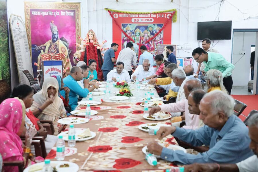 वृद्धजनों को परोसा भोजन तथा सहभोज में हुए शामिल