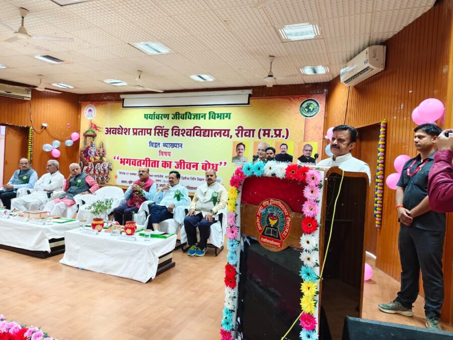 विश्व विद्यालय के पर्यावरण जीव विज्ञान विभाग के तत्वाधान में पंडित शंभूनाथ शुक्ल सभागार में आयोजित कार्यक्रम में उप मुख्यमंत्री ने कहा कि हमारे शास्त्रों व पुराणों में जीवन बोध की व्याख्या है इन्हें अपने जीवन में उतारने से आगे बढ़ने का मार्ग प्रशस्त होता है। उन्होंने कहा कि गीता हमे दिशा दिखाती है। अपनी संस्कृति व विरासत से जुड़कर ही विकास को वरदान बनाया जा सकता है। श्री शुक्ल ने कहा कि गीता में कहा गया है कि जो समाज के लिये नुकसान दायक हो उसे सजा देना आवश्यक है। आज वन्दे मातरम राष्ट्रगीत के 150 वें वर्षगांठ के अवसर पर भारत माँ के वीर सपूतों को नमन करने का भी दिन है जिनके बलिदान से हमें आजादी मिली। कार्यक्रम में सांसद श्री जनार्दन मिश्र ने कहा कि गलत कार्य करने व दुराग्रह को पाल लेने से ही जीवन उन्नति की तरफ जाता है। नागरिक कर्तव्य बोध यह है कि गलत कार्य न करें व गलत कार्य न करने दें। कर्तव्य बोध ही गीता का ज्ञान है। उन्होंने लोगों से गीता को आत्मसात करते हुए सद्मार्ग पर चलने का आह्वान किया।