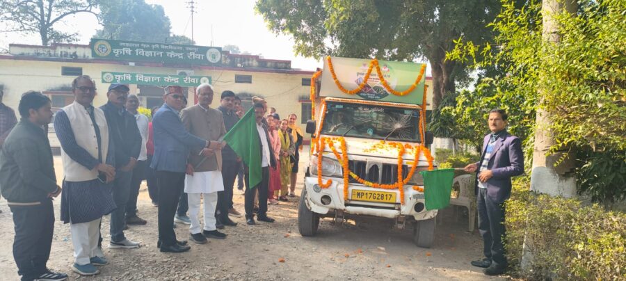 रीवा 11 जनवरी 2026. सांसद श्री जनार्दन मिश्र ने कृषि रथ को हरी झण्डी दिखाकर रवाना किया। उल्लेखनीय है कि प्रदेश में वर्ष 2026 को कृषि वर्ष के रूप में मनाया जा रहा है। कृषि से संबंधित पशुपालन, उद्यानिकी, मत्स्य पालन पर किसानों से सीधा संपर्क कर नवीन व वैज्ञानिक तकनीक सुधार की जानकारी किसानों तक पहुंचाने के उद्देश्य से कृषि रथ गांव में भ्रमण करेगा। यह रथ एक दिन में तीन ग्राम पंचायतों का एक माह की अवधि में भ्रमण करेगा।