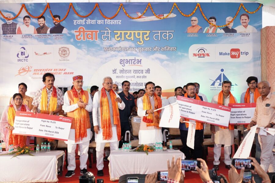 रीवा 17 मार्च 2026. विन्ध्य क्षेत्र को आज विकास की नई सौगात मिली। रीवा एयरपोर्ट से छत्तीसगढ़ की राजधानी रायपुर के लिए सीधी विमान सेवा शुरू हुई। एलायंस एयरवेज सप्ताह में तीन दिन रीवा से रायपुर और रायपुर से रीवा के लिए 72 सीटर प्लेन की सुविधा शुरू की। रीवा एयरपोर्ट में आयोजित समारोह में हवाई सेवा का शुभारंभ किया गया। मुख्यमंत्री डॉ. मोहन यादव भोपाल से वीडियो कान्फ्रेंसिंग के माध्यम से समारोह में शामिल हुए। वीडियो कान्फ्रेंसिंग के माध्यम से दिल्ली से शामिल होकर केन्द्रीय नागरिक उड्डयन मंत्री डॉ. के राममोहन नायडू ने हवाई सेवा का शुभारंभ किया।