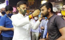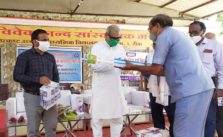 पूर्व मंत्री एवं रीवा विधायक राजेन्द्र शुक्ल ने बांटे मास्क तथा सोशल डिस्टेंसिंग के लिये बनाये गोले